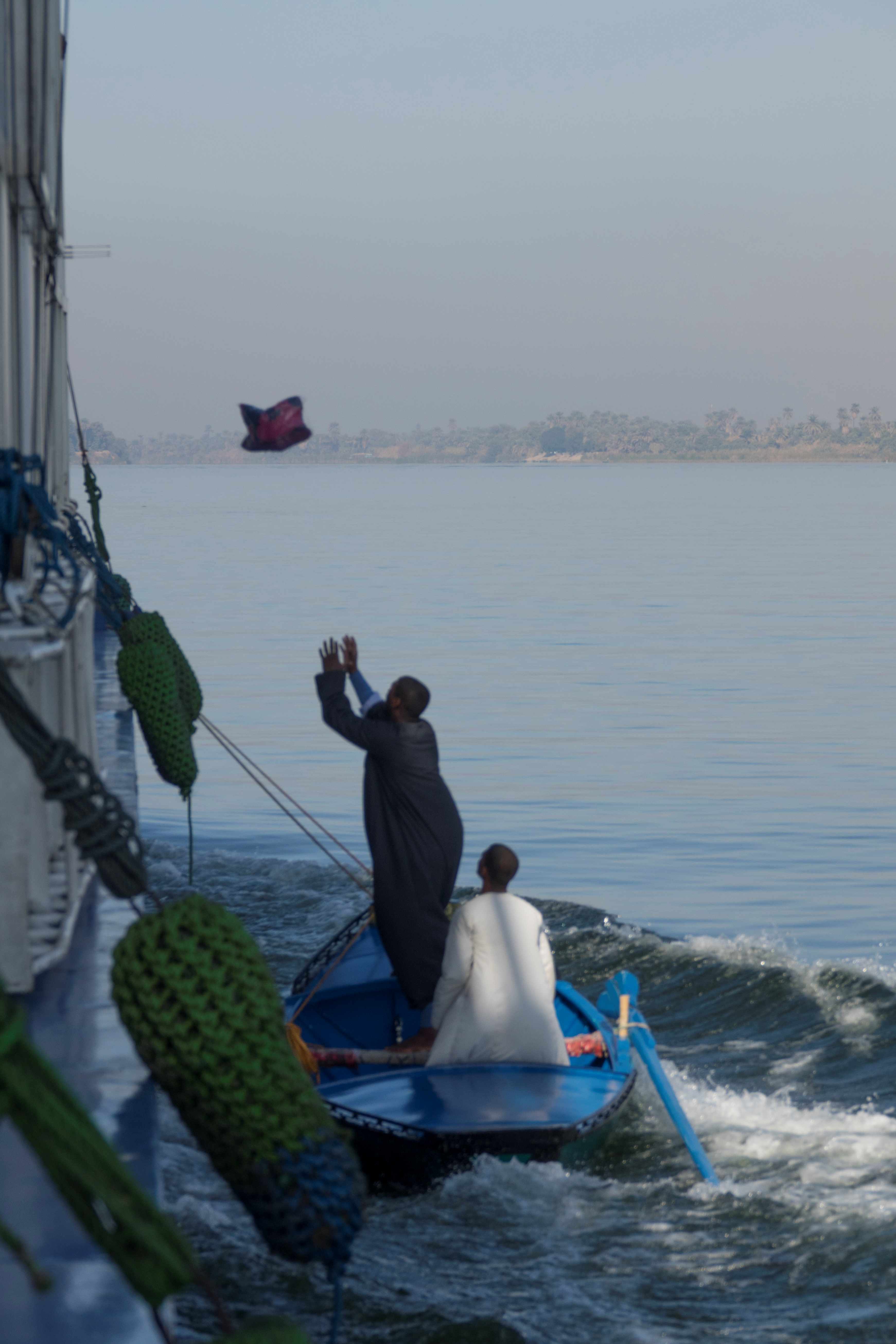 На участке Нила между Эдфу и Луксором наш корабль неожиданно повергся атаке торговых пиратов. Мне приходилось наблюдать штурм фруктовых пиратов во вьетнамской бухте Халонг, когда к нашему прогулочному судну лихо подплывала моторная лодка с фруктами и девушка с помощью удочки с сеткой на конце передавала нам на верхнюю палубу манго и всякие «драконьи глаза» за вознаграждение. Но то, что мы увидели на Ниле, было полной неожиданностью. Представьте: наш огромный и внешне неприступный четырехэтажный круизный лайнер движется по огромной реке, мы сидим в ресторане, который расположен на первом этаже, и вдруг в окне, словно на большом экране, появляется утлая весельная лодочка с двумя речными бедуинами.