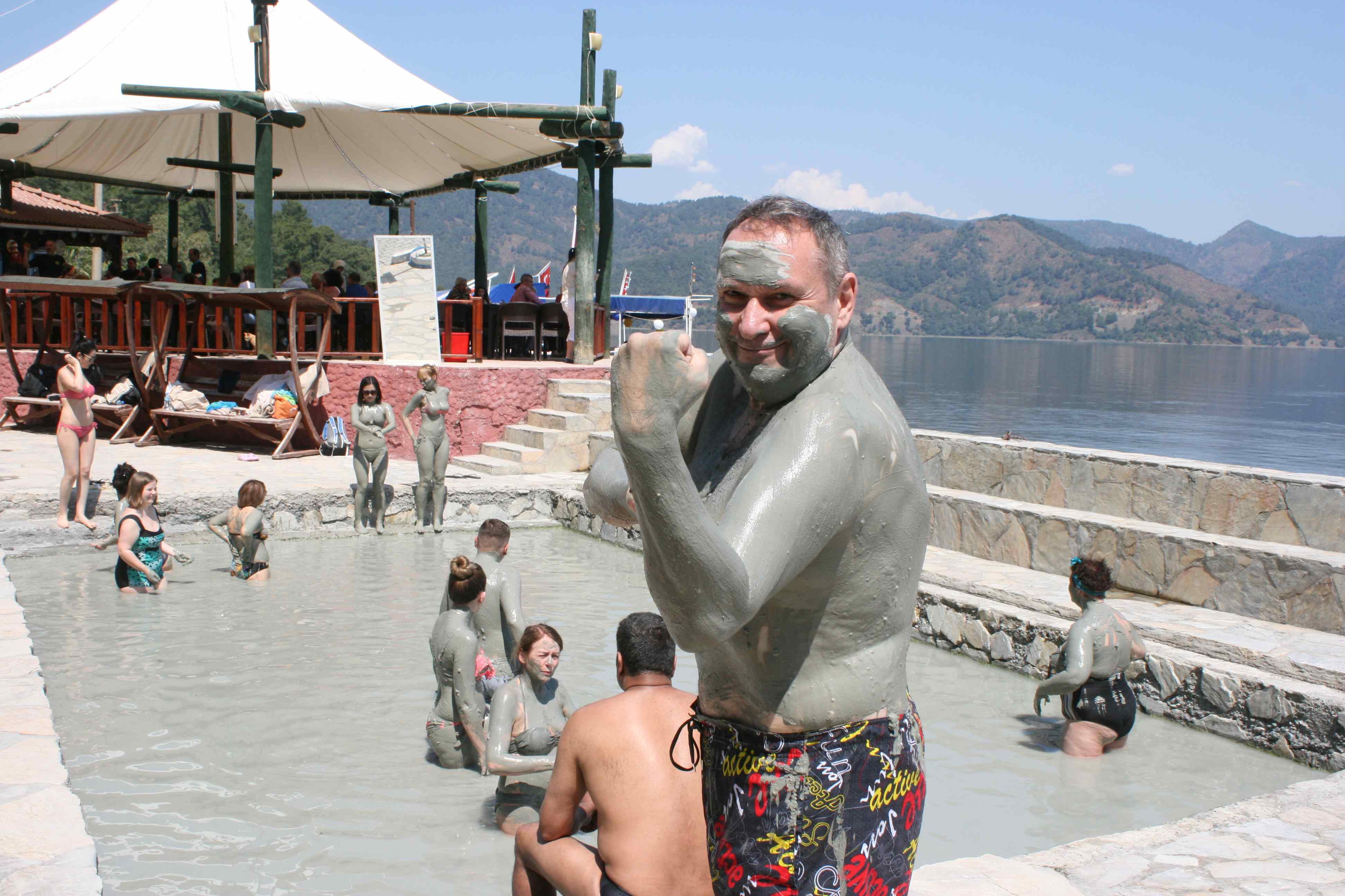 Практически сразу после прибытия мы отправились в «плавучую» экскурсию полюбоваться нетронутой красотой озера, связанного природным каналом с черепашьим пляжем. Вода в озере пресная, но она становится постепенно соленой по мере того, как вы подплываете к морю. Другая особенность озера – в нем бьют горячие источники. Главной целью всей экскурсии стал центр термотерапии Sultaniye Hot Spring. Это место популярно своими радоновыми источниками и знаменитыми грязевыми ваннами.