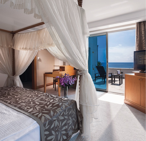 Предмет особой гордости отеля – огромная территория, оформленная в стиле тропического сада, на которой можно с непривычки и заблудиться. Дорогие виллы для не менее дорогих гостей расположены таким образом, что праздный гуляка, изучая окрестности, вряд ли угодит в приватную зону. Троянская тематика, отмеченная в оформлении водного парка и дельфинария, продолжена и здесь – виллы носят имена героев эпоса: Гектор, Парис, Приамус, Элена.