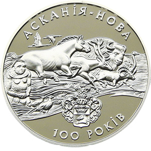 В официальном описании сюжета значится: «На реверсе размещена композиция, состоящая из изображения степной каменной бабы и динамической группы акклиматизированных в заповеднике животных». Кстати, сразу под рисунком помещен родовой герб Фридриха Эдуардовича Фальц-Фейна (1863–1920), который и основал «Новую Асканию»2 в 1828 году.
