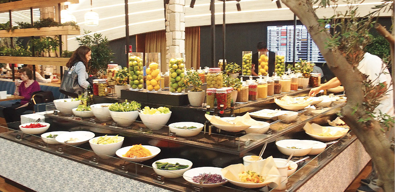По всей территории лаунж-зоны разбросаны островки со шведскими столами, напичканными всевозможными закусками, выпечкой, фруктами, десертами, тут же стойки с элитными алкогольными напитками, чайные и кофейные автоматы, холодильники с соками и прохладительными напитками. И, наконец, множество точек, где без устали колдуют повара, непрерывно что-то нарезая, смешивая, жаря, выпекая. Количество блюд – и европейской, и турецкой кухни – огромное. По сути здесь можно организовывать полноценные гастрономические туры.