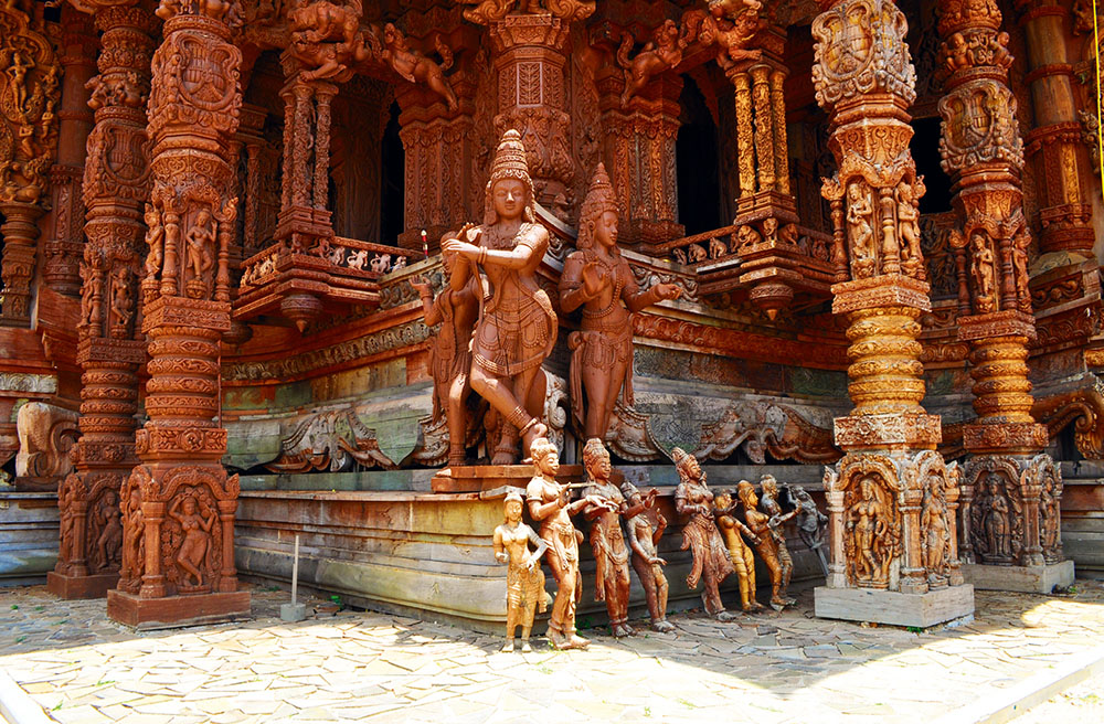 Четыре входа в храм посвящены ветвям буддизма Китая, Камбоджи, Таиланда и индуистским богам Индии. С высокими шпилями в буддийском стиле и многочисленными «охранителями» наверху, полностью украшенный снаружи и внутри искусной резьбой по тику и красному дереву, этот величественный храм, говорят, самое большое деревянное здание в мире. А строить его начал представитель очень богатой паттайской семьи, после которого дело продолжили его дети. Храм этот, как говорят, не будет закончен никогда.