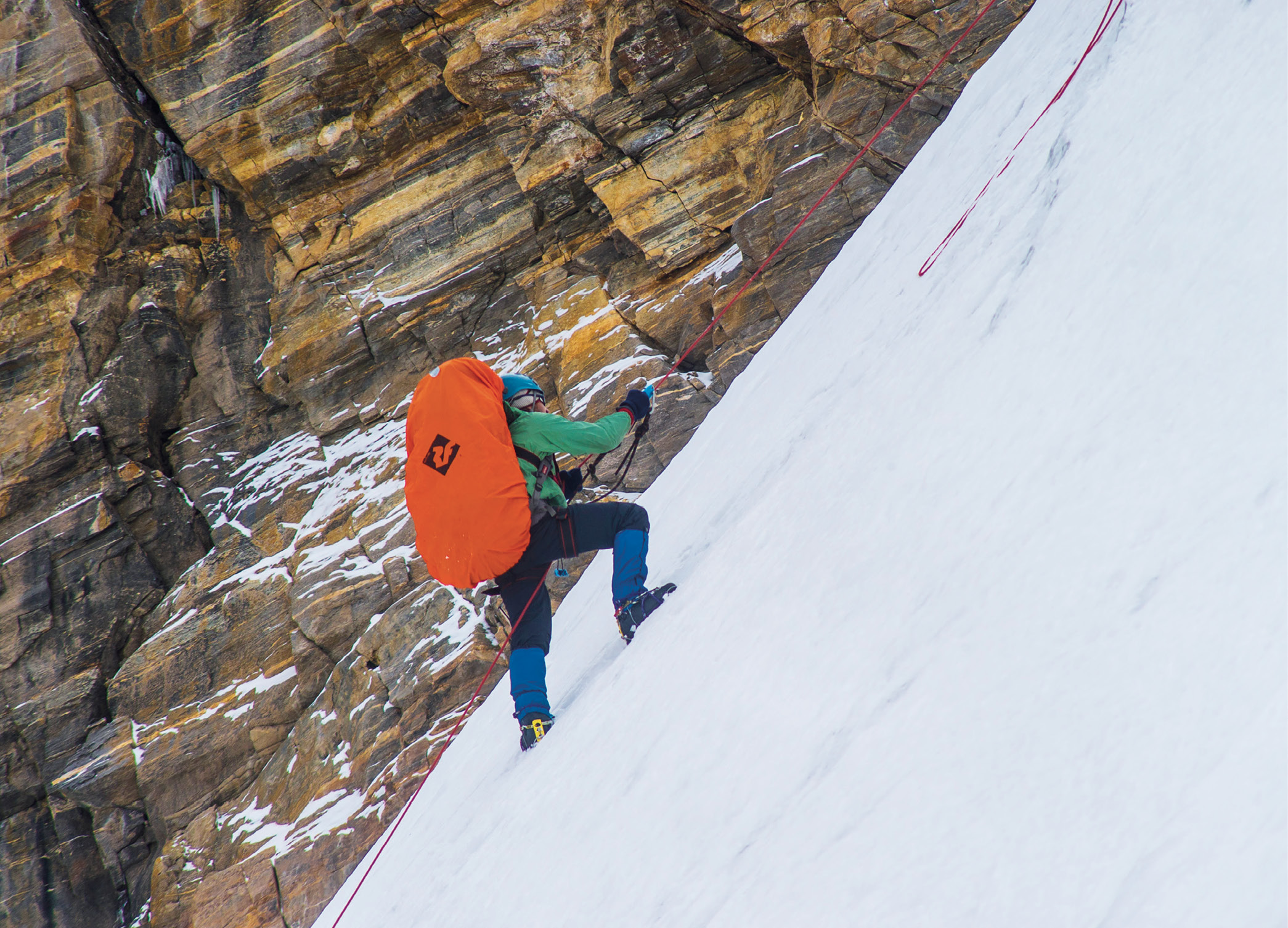 Ночь была нервозной, все спали с опаской, что лёд под палатками может треснуть и это добавит проблем. Обошлось. Сборы немного затянулись из-за неудобной ночевки. Первая тройка пошла дорабатывать перила до самого перевала, и уже через два часа первый участник ступил на перевал. Он работал без рюкзака. Всего от бергшрунда до перевала было провешено 140 метров вертикальных перил. Крутизна доходит до 80°. Самыми крутыми оказались последние 15 метров натёчного льда. Наконец, остальные участники прошли перила, и в 10:30 утра группа достигла перевала...
