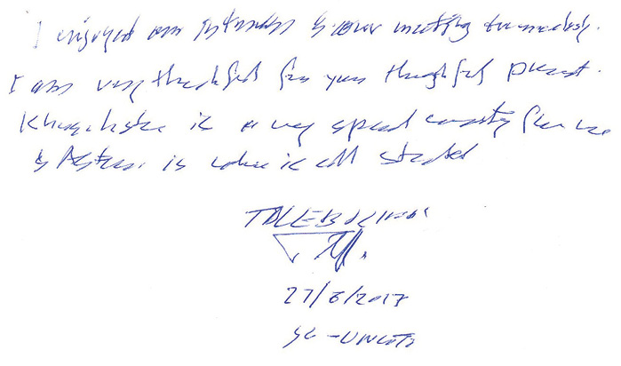 «Я получил невероятное удовольствие от нашей беседы и встречи. Я очень благодарен вам за ваш вдумчивый подарок. Казахстан для меня особая страна, а Астана – это то место, где всё для меня началось».