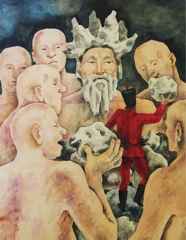 Совсем иными по настроению оказались расположенные по соседству акварельные иллюстрации Жужы Перели (р. 1947) к сказке в стихах Шандора Петёфи «Храбрый Янош» о том, как юноша-сирота становится королем страны фей. Яркие цвета, драконы, великаны, ведьмы, принцессы – здесь царила атмосфера фантазии и легкой улыбки.