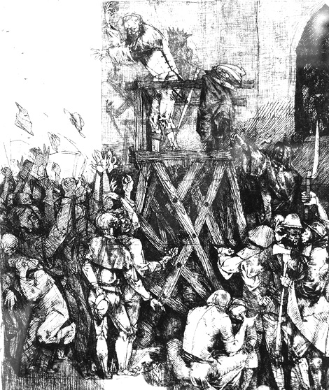 Пожалуй, самой значительной среди выставленных работ представляется серия из 14 гравюр Бела Кондора (1931 – 1972) из цикла «Дожа», рассказывающего о крестьянском восстании 1514 года под предводительством Дьёрдя Дожи. Трагические, с резкой графикой, напоминающие чем-то офорты Гойи, эти гравюры имели неслучайную дату создания – лето 1956 года. Написанные за два с небольшим месяца до Венгерского восстания против тоталитаризма, офорты мастера стали пророческими.