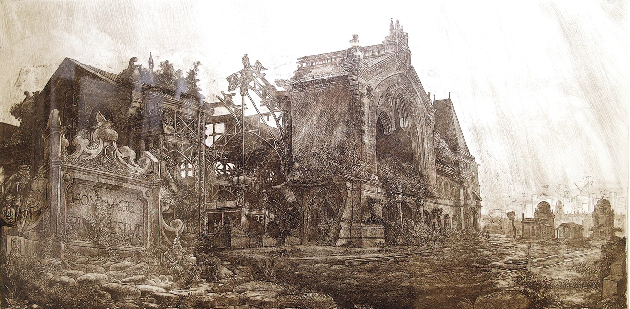 А вот тема цикла офортов из 10 листов «Похвала Пиранези» сравнительно молодого художника Мартона Такача (р. 1971) весьма необычна. Он изображает руины современных европейских столиц в воображаемом далеком будущем, когда нынешняя Европа станет таким же античным миром, как Древний Рим. В 1994 году состоялся конкурс «Будапешт глазами Пиранези», благодаря которому Такач основательно погрузился в творчество итальянского мастера архитектурных пейзажей и, освоив его язык, стал создавать свои удивительные офорты, обращенные одновременно и в прошлое, и в будущее. «Всё – суета сует. Что было, то и будет; и что делалось, то и будет делаться, и нет ничего нового под солнцем» (Экклезиаст).