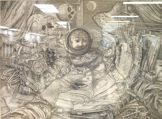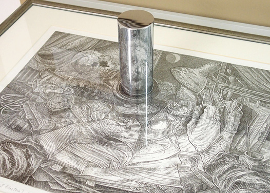 У этой работы постоянно толпились люди, а сама гравюра лежала на подставке вместе с небольшим металлическим цилиндром, отполированным до блеска. Рядом на стене висела копия. Сюжет гравюры представлял барочный натюрморт: на столе, заваленном, как у средневекового алхимика, различными измерительными приборами, старинными манускриптами, черепами, стоит посредине зеркало, в котором отражается лицо автора, сидящего за этим столом и листающего книгу. Но если на это зеркало сверху поместить упомянутый цилиндр и взглянуть на него под определенным углом, то на его боковой поверхности, собирающей и преломляющей отражения от отдельных участков гравюры, вдруг начинают проступать черты лица, хорошо знакомые любому школьнику. На вас с лукавством взирает невесть откуда взявшийся создатель теории относительности Альберт Эйнштейн. Вот таким необычным образом художник выразил дань уважения перед ученым, чей гений, свободный от шаблонов и предрассудков, оказал столь мощное влияние на мировоззрение и культуру современного человечества.