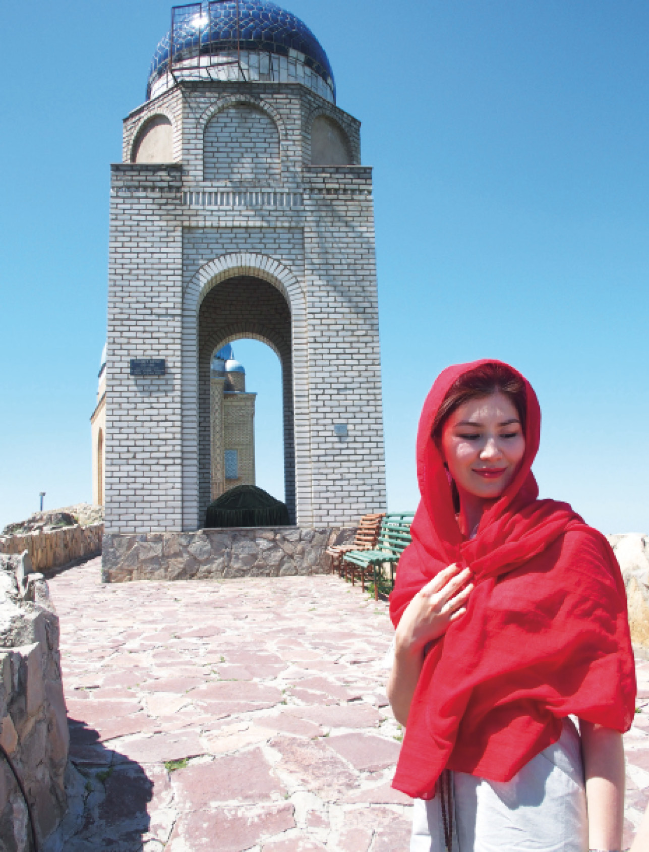 Поодаль расположились нарядный круглый шатер Ассамблеи народа Казахстана (часто называемый «Домом дружбы») и достаточно оригинальная стела «Мелодии Тараза» («Тараз сазы»).
