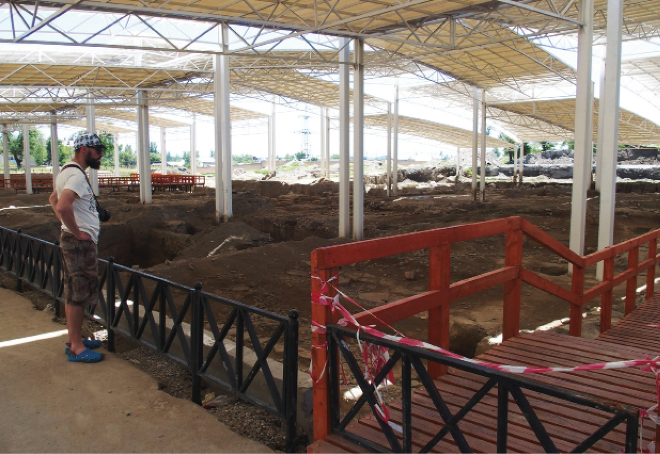 ...Медленно переходим мы от одного места раскопок к другому. К сожалению, несмотря на то, что уже проложены мостки для будущих посетителей, сделаны ограждения, установлены своды, защищающие от осадков, археологический парк до сих пор полностью не открыт. Для обозрения доступна лишь часть территории, но и этого достаточно, чтобы получить представление о древнем сооружении, особенно если призвать в помощь и собственное воображение.