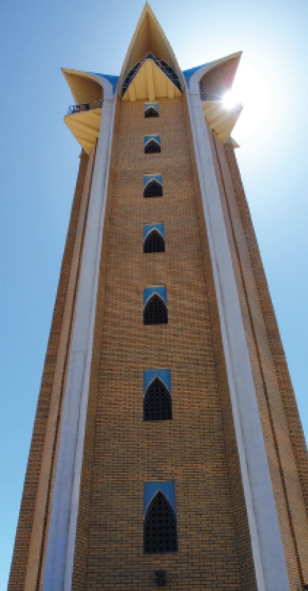 Рядом в виде 34-метрового степного тюльпана золотисто-голубых оттенков высится смотровая башня, с которой открывается замечательная панорама всего комплекса и становится понятен замысел самих архитекторов.