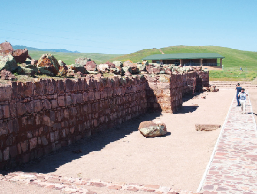 Прямо посреди степи у подножия гор, где кроме высоковольтной линии электропередач ничто не напоминает о человеческом присутствии, раскинулось царство огромных обтесанных валунов красного цвета. Где-то они лежат совершенно хаотично, в других местах, соединенные кладкой, образуют стены, которые тянутся на приличные расстояния и в некоторых местах достигают высоты метра два и выше. Это сейчас. А раньше, как рассказывают старожилы, даже верхом на лошади ничего нельзя было увидеть за этими каменными грядами – настолько высокими были сооружения (увы, когда в прошлом веке в этих краях стали строить зернохранилище, многие камни растащили на стройматериалы).