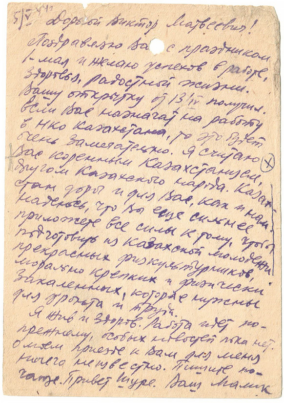 У меня больших, да и особых новостей нет. Живу и работаю по-прежнему. Хорошо, что товарищи по институту Сильченко, Линчевский, Жаутыков и другие передают мне развернутый привет, но они не могли написать мне хоть пару слов. Очевидно, у них не хватает смелости написать. Пусть так и будет. Если будем живы, найдем язык поговорить с ними.