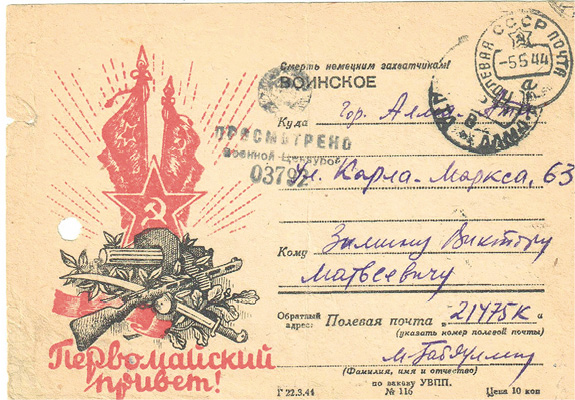 И еще одна почтовая первомайская открытка, отправленная Виктору Матвеевичу Маликом Габдуллиным уже 5 мая 1944 года: