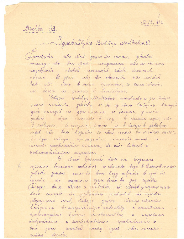 Еще одно письмо от 12 декабря 1941 года (Москва-53, п/я 3857/р, просмотрено военной цензурой), которое пришло в пединститут от Андрея Лещенко: