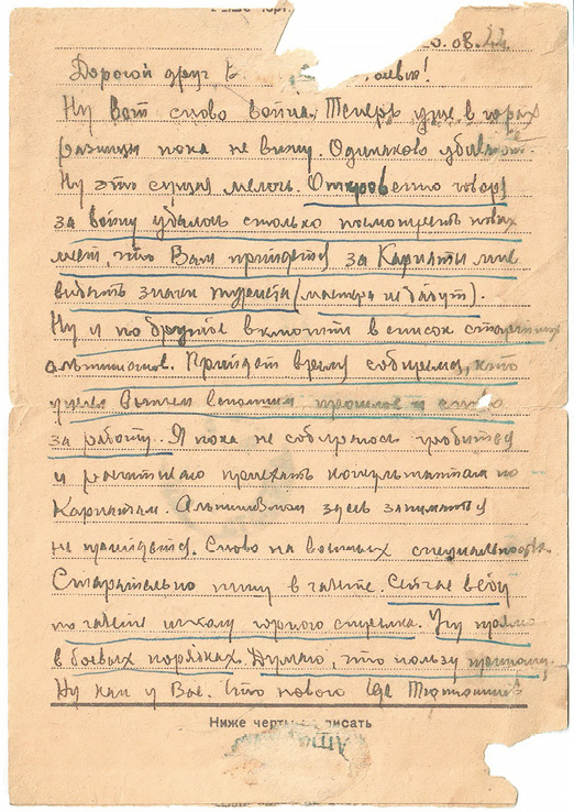 Лично про себя не могу сказать ничего особенного, чем можно было бы удивить Вас, да и причем Вы не из таких, которых можно удивить. За это время я 3 месяца пробыл на фронте, 1,5 месяца в госпитале, ну и остальное время в запасных частях. Конечно, «встречался с чистенькими чистокровными арийцами», устраивая дуэль. С фронта я уехал из-за ранения, ранена у меня правая рука, сейчас уже ничего, как видите, даже пишу письмо.