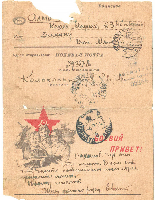 Огромное множество фронтовых писем и почтовых открыток приходили к Виктору Матвеевичу Зимину – основоположнику казахстанского альпинизма и туризма, мастеру спорта СССР. Они взяты из архива этого замечательного человека, которому в январе этого года исполнилось бы 115 лет. Я учился у него в 68-м году в республиканской школе инструкторов горного туризма. Виктор Матвеевич был наставником многих молодых альпинистов и туристов довоенных лет, учил их азам техники и тактики горовосхождений, совершал со многими из них восхождения на вершины, а также лыжные, велосипедные и горные походы еще в далеких 30-х годах. Всё это пригодилось его ученикам, когда началась война и они ушли на фронт, а кому-то, возможно, спасло жизнь.