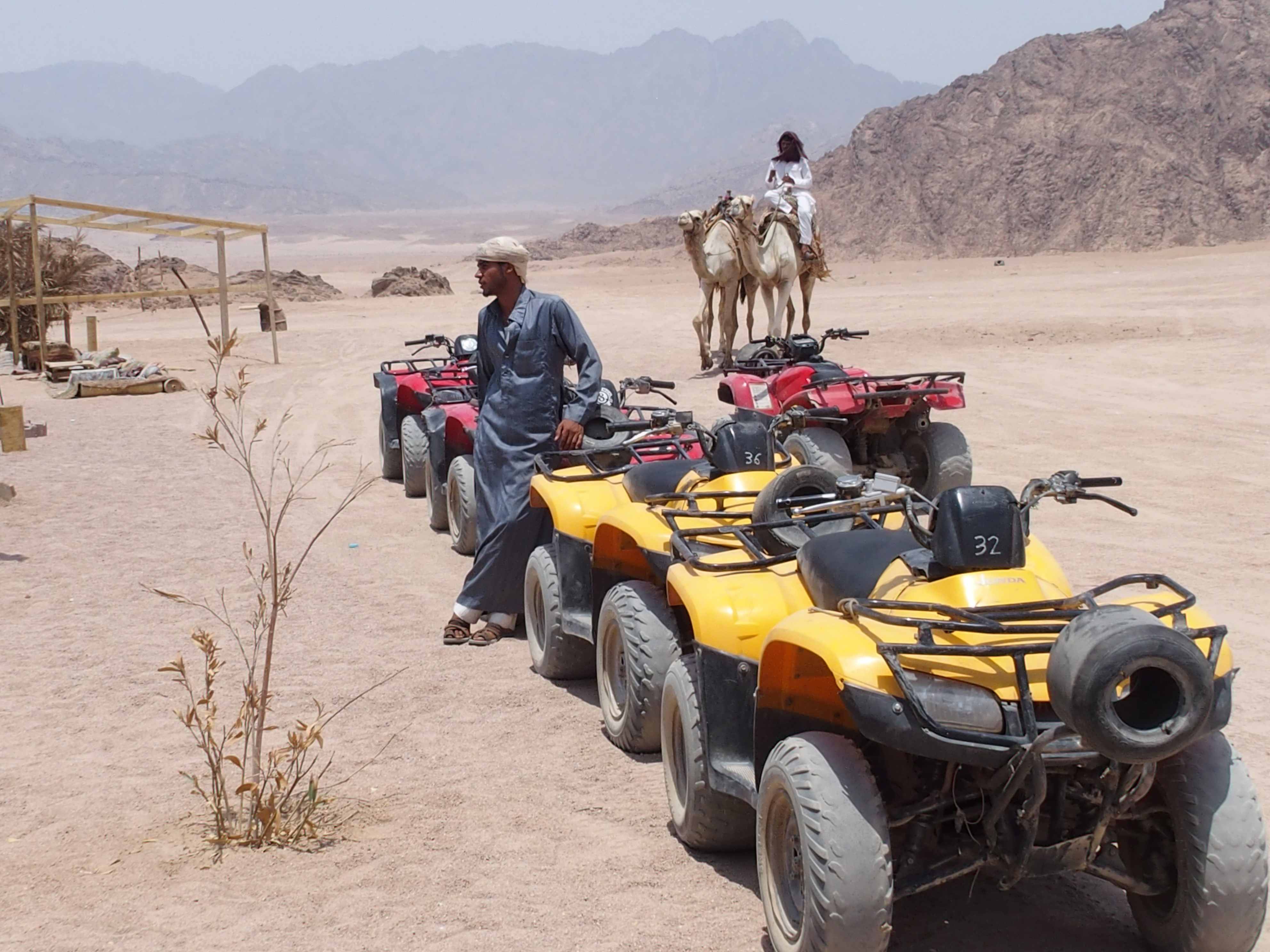 Одним из самых ярких моментов нашего пребывания на Синае стало путешествие по пустыне на квадроциклах с привалом в бедуинском поселении. Бескрайнее небо, простор, пустыня, горы, скорость, свобода – вот что такое мотосафари на Синае! Мы здесь совершенно одни среди пустынного пейзажа, чем-то напоминающего марсианский.