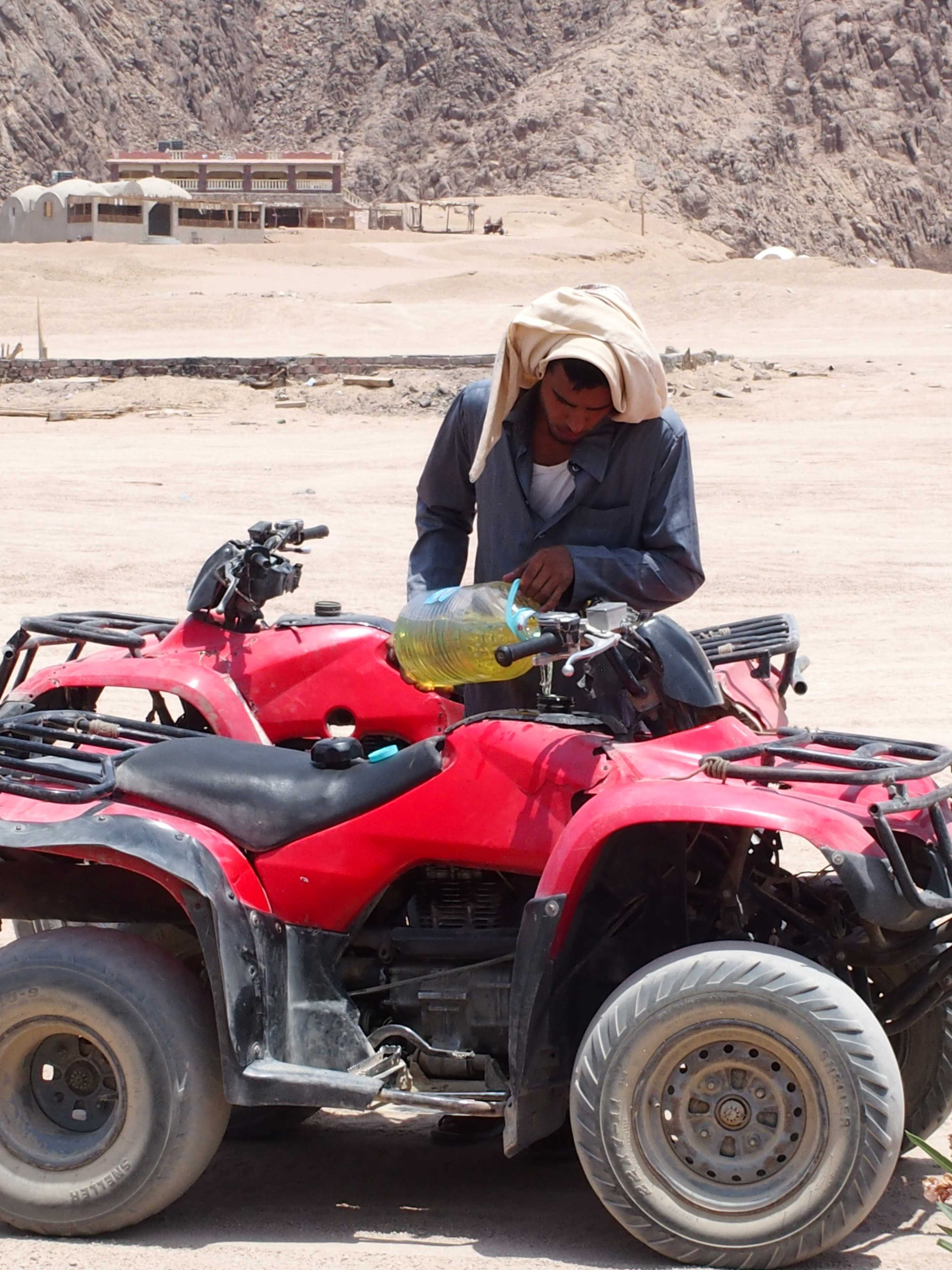 Но какое путешествие без приключений! Неожиданно после одной из остановок глохнет мой квадроцикл. Подъехавший гид констатирует клиническую смерть вследствие отсутствия бензина. В итоге вшестером на двух квадроциклах мы с трудом добираемся до бедуинской стоянки, благо она была уже близко.