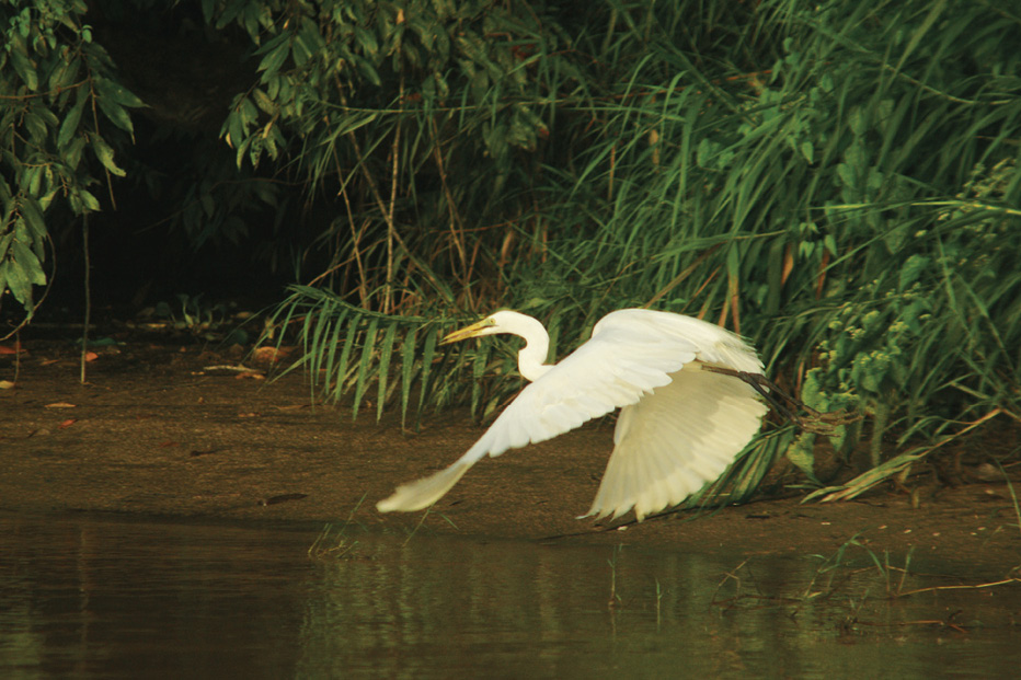 Плыли мы по течению реки довольно долго, пока не добрались до небольшого притока, и дальше уже по этой маленькой речушке стали забираться все глубже и глубже в джунгли. Кроны деревьев смыкались над головой, и казалось – мы плывем в сказочном туннеле. Деревья оккупировали птицы-носороги разных мастей, а на берегу были видны следы слонов, спускавшихся к водопою. Наконец, мы увидели просвет в конце нашего туннеля и выехали в заводь – небольшое озерко, окруженное высокими деревьями.