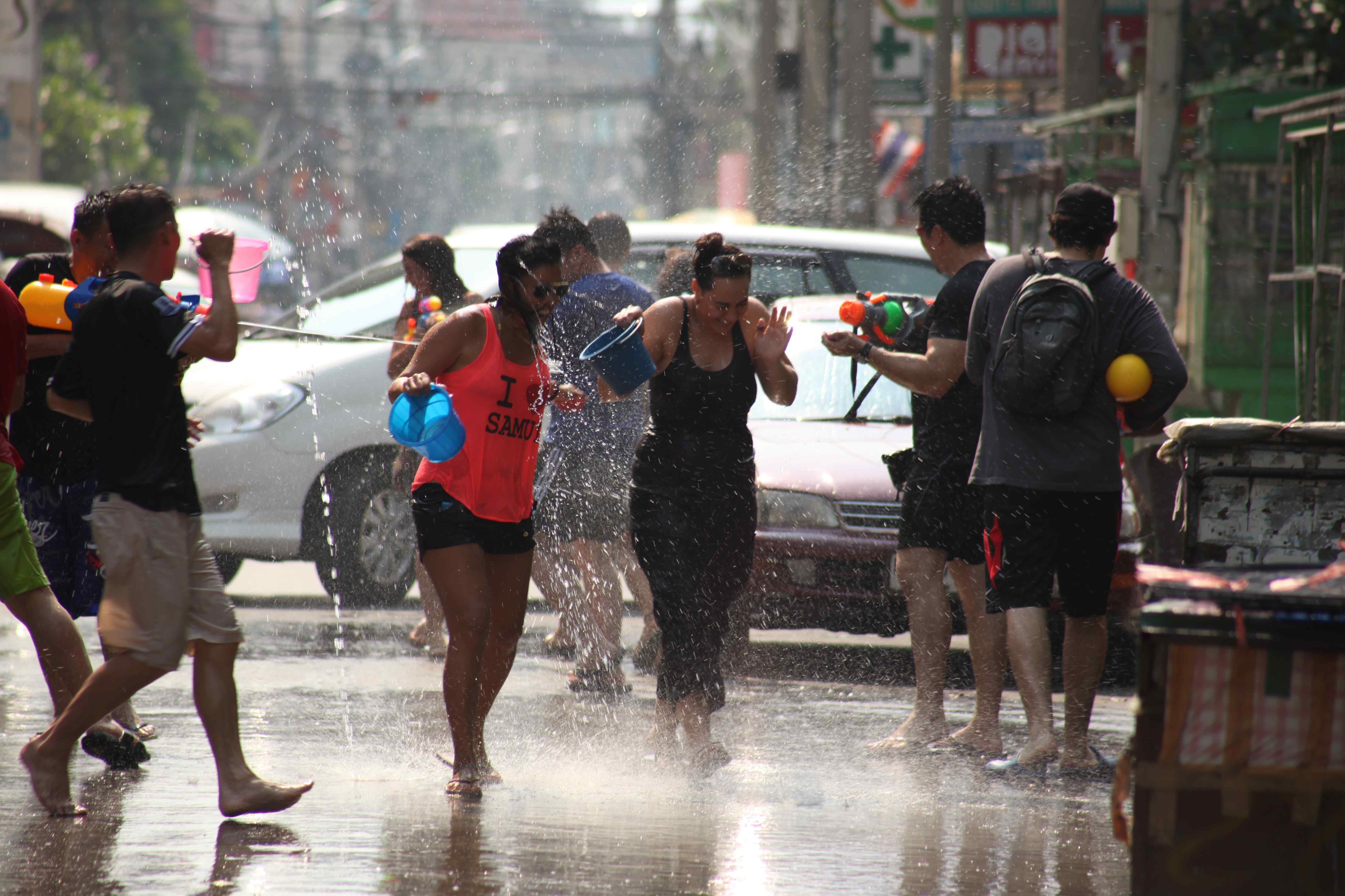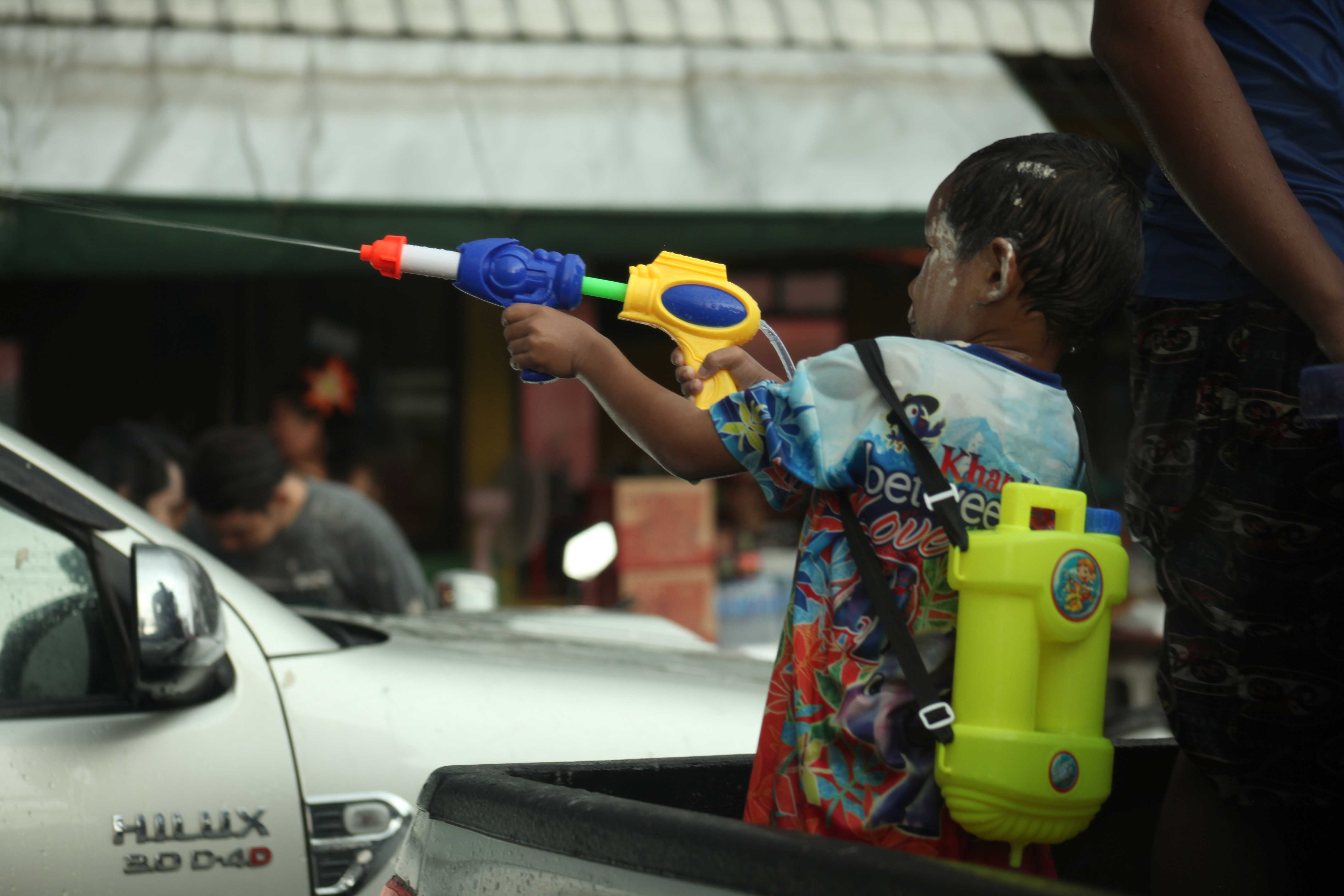 Во-вторых, есть традиция: раньше в Сонгкран тайцы ходили по улицам и брызгали водой на прохожих, а сейчас радостно поливают всех подряд из всего, что попадется под руку, - ведер, водных пистолетов и даже шлангов. Тайцы, в основном, конечно, юные, шастают по улицам с емкостями, наполненными водой, и поливают встречных. Что, в общем-то, в апрельскую погоду довольно приятно.