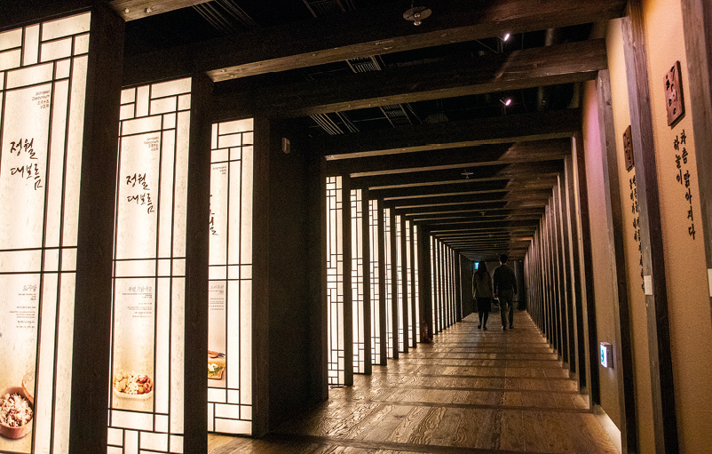 Музей корейской гастрономической культуры хансик имеет необычный дизайн. Здесь, как нигде лучше, можно почувствовать атмосферу традиционной Кореи. Особенно поражают своей красотой необыкновенные деревянные решётчатые двери во всю стену. В промежутках между ними находится описание сезонных блюд корейской кухни. Кроме этого здесь вы увидете разнообразные злаковые страны, а также приправы и специи. У вас будет возможность насладиться и необычным музыкальным видеопредставлением, проецирующемся на стилизованном помосте для хранения чанов-горшков «онги».