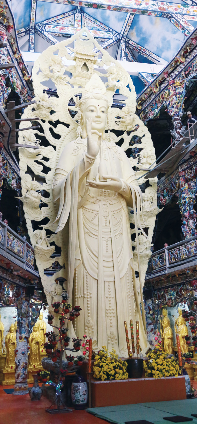 По старой ветке железной дороги мы добрались до пагоды Линь Фуок и словно попали в сказку. Яркая и пёстрая пагода отделана битым фарфором, стеклом, керамикой. Разноцветье необычных фигур завораживает. В основном молельном зале находится огромная статуя Будды, ещё одна – под навесом на улице. Причудливые фигуры и атмосфера полного покоя никого не оставят равнодушным.