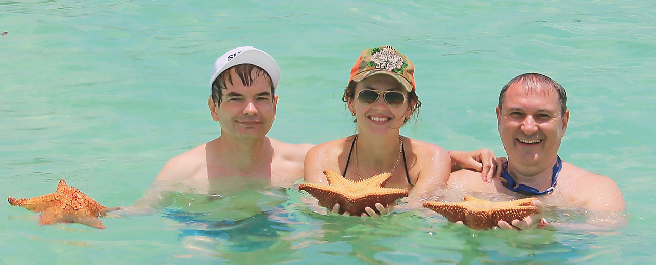 Нашим следующим привалом на пути «карибских приключений» стал двадцатизвездочный морской отель на мелководном участке моря (называемом еще природным бассейном), где мы обнаружили два десятка настоящих морских звезд. Карибские звезды по праву считаются одними из самых эффектных красавиц во всем подводном королевстве, чьи одеяния, словно скроенные из дорогой парчи благородных цветов, напоминают наряды придворных дам минувших столетий. Они действительно восхитительны, вот только после визита к ним остался ряд вопросов. Но сначала перескажу, что поведала нам Леона.